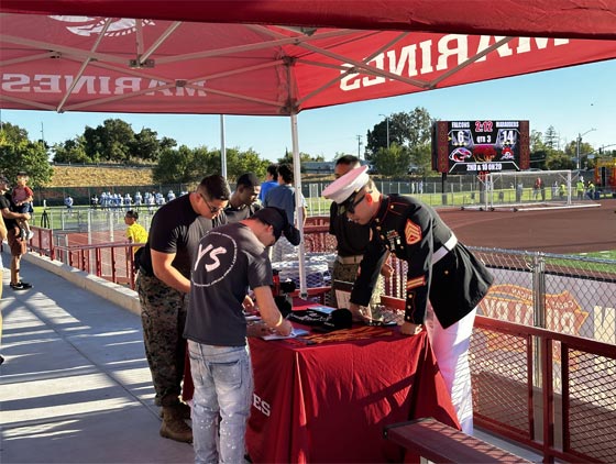A U.S. Marine Corps recruiting tent at a local high school football game, providing high school students and potential recruits the opportunity to learn more about the advantages of a military service career.