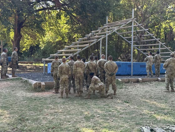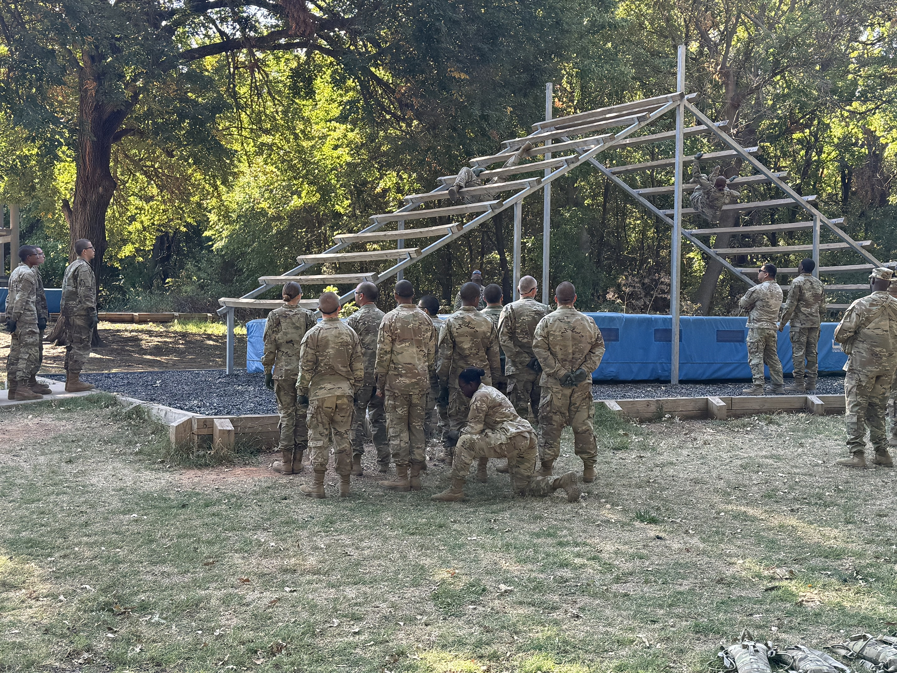Military recruits testing their upper body strength, coordination, and confidence in navigating vertical structures on the A-frame cargo net or ladder climb. The purpose of this challenge is to build physical fitness, enhance teamwork, and prepare recruits for the physical demands and problem-solving required in military operations.