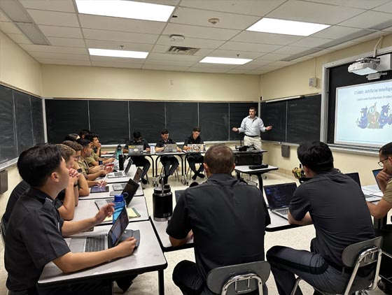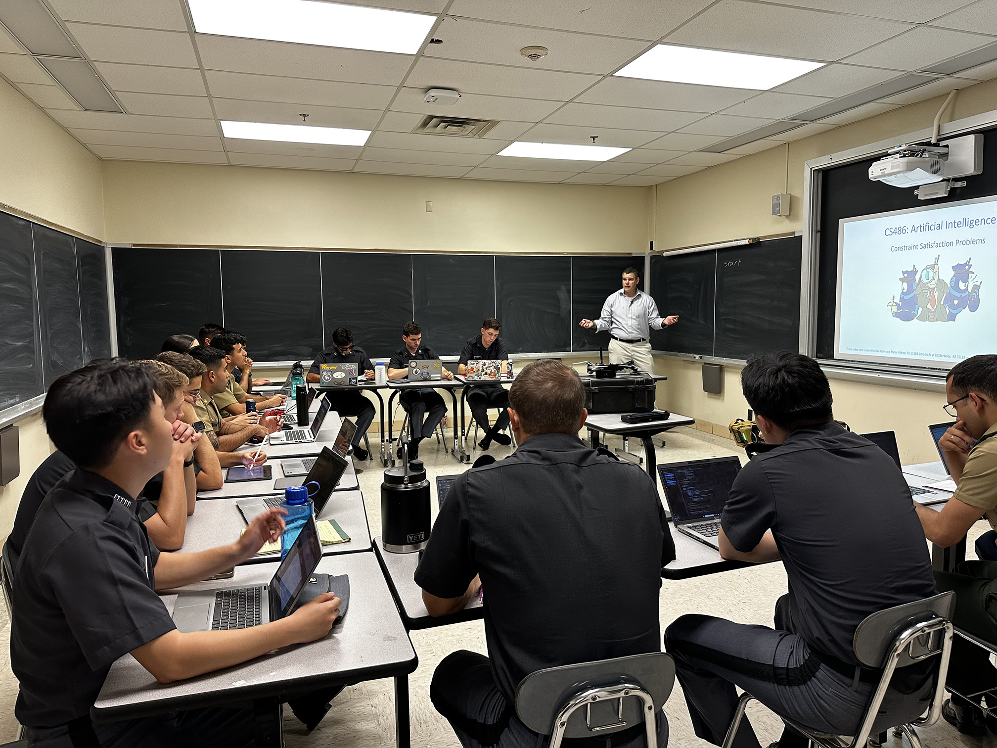 Military personnel engaged in a classroom lecture on artificial intelligence as part of their advanced training.