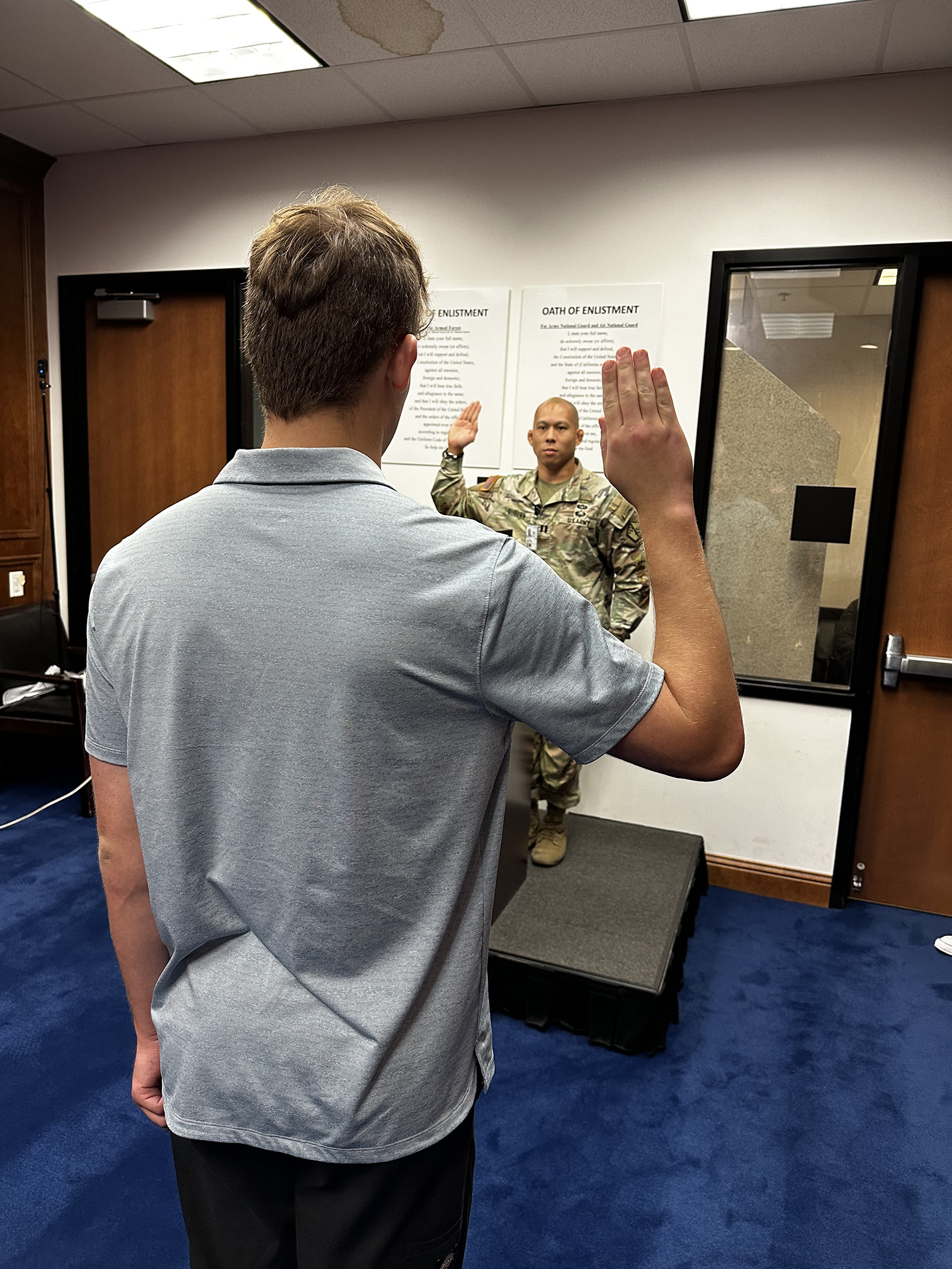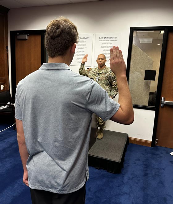 A new recruit takes the Oath of Enlistment, guided by a military officer, marking the beginning of their service commitment.