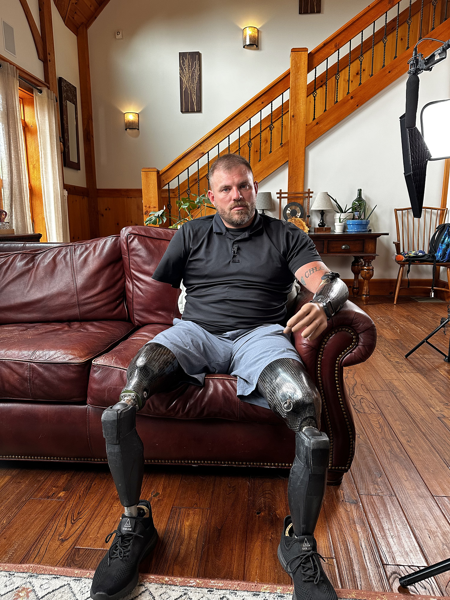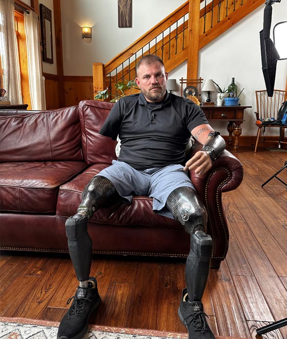 Retired U.S. Army Staff Sergeant and quadruple amputee Travis Mills sits in the living room of his home in Maine. Travis is the founder and president of the Travis Mills Foundation, which provides an environment for post-9/11 recalibrated veterans and their families to enjoy peace and tranquility.